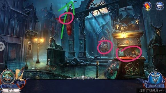 圆顶左侧,暗门——放机械面罩,放暗门密码——根据提示调整——进入【剧场后台】