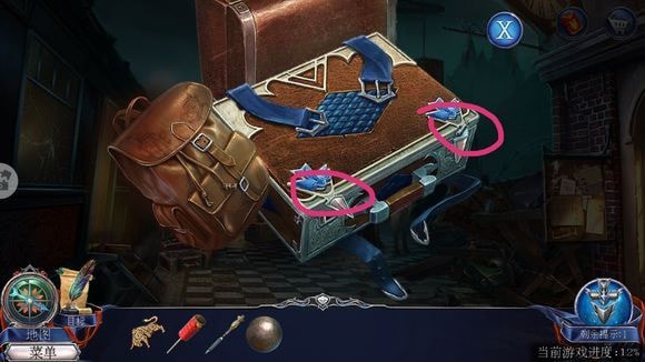 左侧地上,箱包——箱子上安手提箱标识,用指甲锉——打开箱子——权威文件,火枪