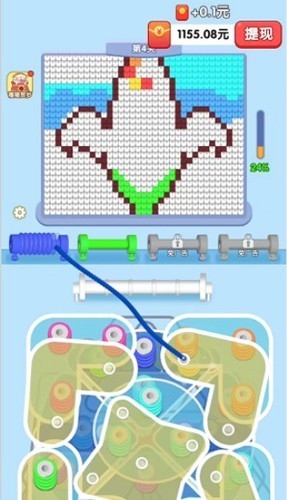 2、填充谜题:当柱子被毛线完全包裹后,系统会自动将毛线填充到上方的谜题框架中,随着游戏的进行,填充进度实时显示在屏幕上方。