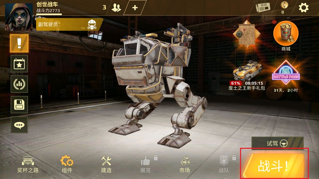 在《创世战车》移动版中,有一个与端游类似的高亮战斗按钮和一个试驾按钮。点击试驾按钮就可以在车库中对你的战车进行测试驾驶,而点击战斗按钮则会先进入模式的选择界面。