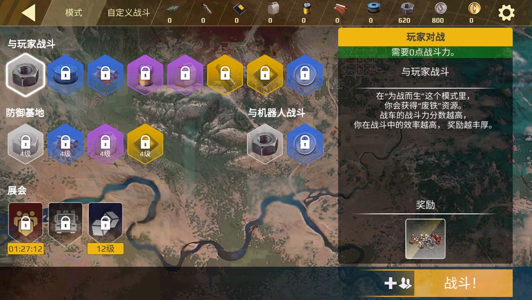 如下图所示,战斗的选择界面分为三大块:与玩家战斗、防御基地和与机器人战斗,以及乱斗模式的“展会”。通常来讲,“防御基地”接近于我们传统认知中的PvE:定时刷新敌人,保护目标点。