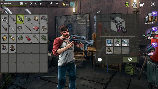中年男子右手紧握大刀,大刀是一把近战武器也可以砍伐一些树木,最右边显示的百分比是关卡的进度,左边是背包的详情,在这里可以查看玩家目前拥有的资源和装备,玩家共可以装备8件装备,衣服类可以增加玩家的血量和防御,医疗包可以恢复玩家血量,或者复活。
