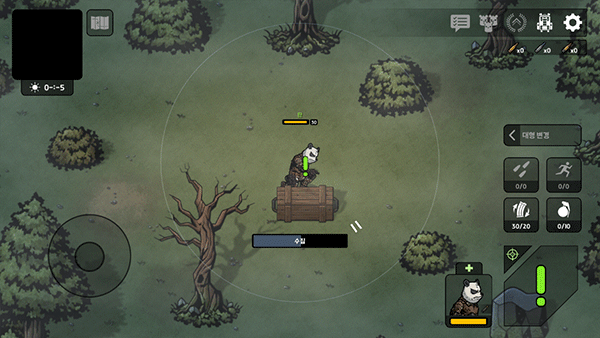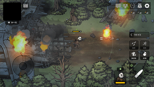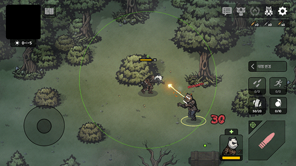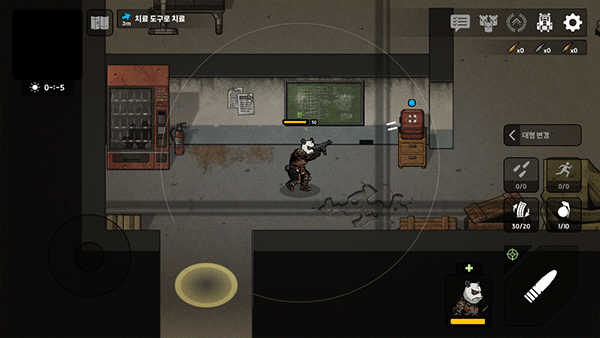 1、进入到游戏内,通过左边轮盘控制移动方向,右边控制射击、拾取等操作