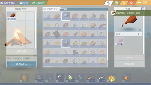 建议萌新以肉食为主,可以制作一些简单的“石器”捕获兔子或其他动物,搭上营火进行烤肉。食用肉类可以获得更久的饱腹感,充饥备用效果远比蔬菜更好。