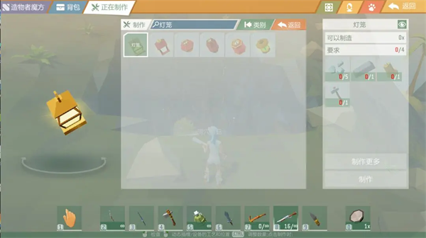 在岛屿上最基础的原材料包括但不限于“草、木棍、石头、燧石”。而玩家通过拾取一定数量的原材料,然后打开“制作面板”,查找或直接输入你想要制作或合成的道具名称,根据提示逐步完成制作。