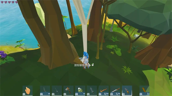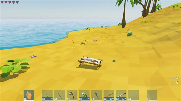 2、而在屏幕的左上角的小红心就是玩家的血量,总共5个血,当没有装备面对一只狼豹等肉食生物的攻击时,血量会迅速下降,所以前期要避开主动进攻的生物。艾兰岛添加了温度、饱食度等设定。这也就意味着当人物饥饿、寒冷时会持续缓慢掉血,总而言之,生存环境不合适的话,掉血是比较迅速的,所以玩家要尽快给自己组建起一个可以生存的空间。