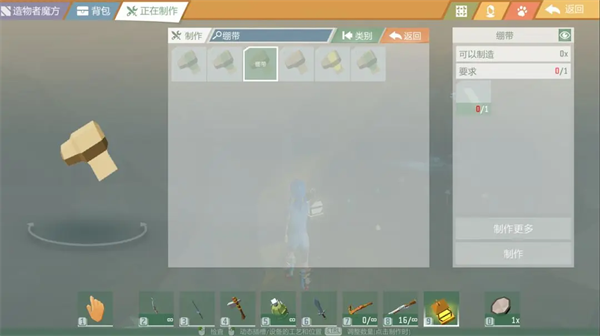 例如,现在要制作一把“石刀”,打开制作面板后遇到提示,需要“1根任意绳子”以及“1块燧石”。但现在背包中只有“燧石”没有绳子。所以,我们需要优先使用“草”来制作合成一根草绳。