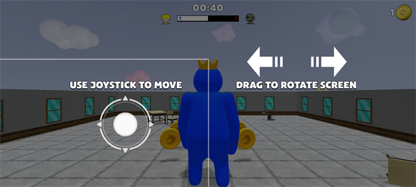 1、下载进入彩虹朋友躲猫猫游戏,滑动左侧的方向盘即可控制角色移动,右侧可环绕四周;