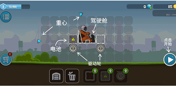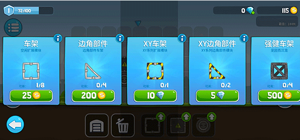 就这样不停过新手关刷钱,涡轮发动机必须有一个,粘性车轮必须有,两个就够,骷髅车架买四个,蓄电池买一个
