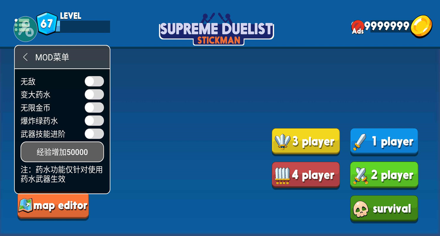 5、设置里面可以调节重力(建议开启),设置里面的能量护盾开启表示局内有蓄力特效和武器间的格挡(建议开启),瞬间死亡关闭后掉入海里不会直接死亡而是掉血并弹飞(建议关闭)