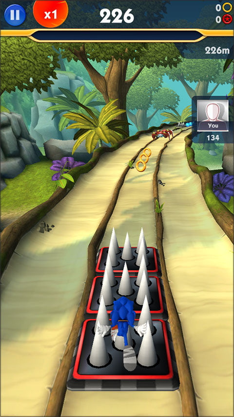 游戏的操作非常简单,通过手指的触动来控制上下左右的方向,一开始索尼克就会飞速向前狂奔,跑酷途中左右滑动屏幕可以控制索尼克左右切换跑道,向上滑动屏幕是跳跃,向下滑动屏幕是匍匐翻滚,大概的操作就是这些,看似简单,但是因为沿途各种各样的障碍物以及越来越快的速度,游戏还是非常具有挑战性的。