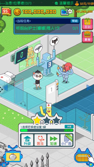 7、诊室升级建议:全部上限升级到4级,5级后面有罐头的再去升级,优先升到2级,解锁清洁功能,点满可减少治疗时间和增加特殊患者出现几率。