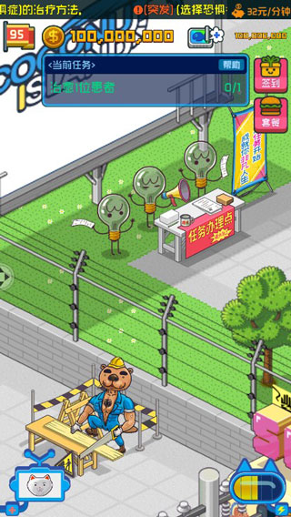 超脱力医院正版是一款非常恶搞的医院题材游戏,这里有很多奇葩的病人,同样他们的病症也都是很奇葩的,因此我们也可以使用独特的医疗技术去进行治疗。游戏中的画风也是十分搞怪,一群角色聚在一起简直就是群魔乱舞,大家可以看到迎风狂舞的门前吉祥物、对片狂撸的斯文狼、洗剪吹箱猫三人组等魔性的角色,我们可以招募很多医生来治疗这些病人,然后还可以扩建医院并服务更多的病人。玩家们将成为这所医院的院长,需要倾尽所能打造一座能称霸银河系的精神病院,大家可以通过升级诊室、放置观赏植物、音乐等道具提升病人的满意度,当满意度越高治疗时间随之缩短,自然收益也会更高。同时游戏中还为大家准备了许多神秘的道具,这些道具可以帮助大家发现更多隐藏的故事。