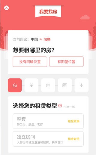 3、点击我要找房,选择租房位置,选择租房类型;