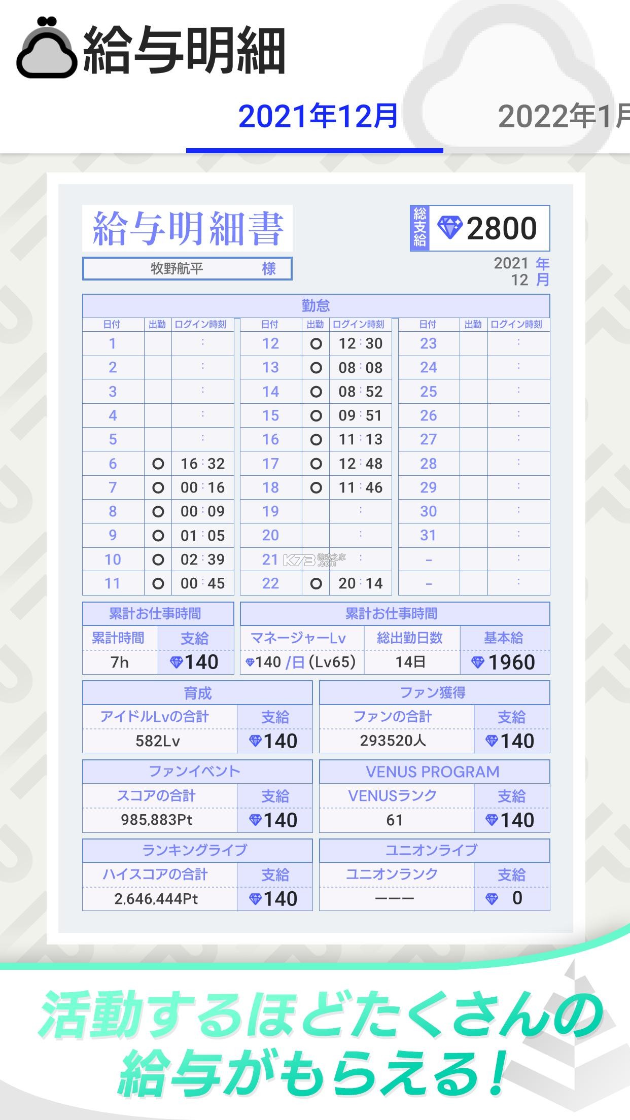 在这一界面中,大家可以看到根据经纪人等级及累计登录天数计算出来的“基本收入”,随游戏时间增加的“累计工作时间收入”,基于加入偶像养成等级的“养成收入”等等。通过这些项目,玩家每月都可获得类似“工资”的钻石收入,每月的收入也将以“工资单”形式展示给玩家。这一相当彻底被贯彻的形式时刻在提醒着玩家们,本游戏是超越了一般游戏的“经纪业务”。