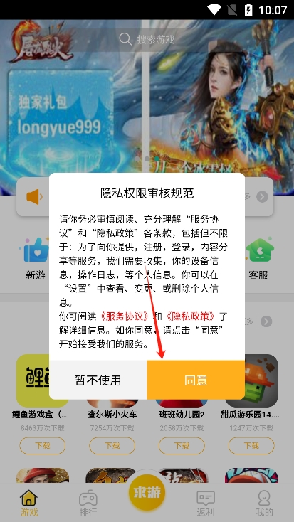 2、进入后阅读并同意鲤鱼游戏app的用户协议