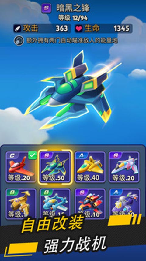 1、玩家可以升级自己的战机,打造强力的S级装备,组合成专属的战机,准备迎接终极boss战斗的挑战。