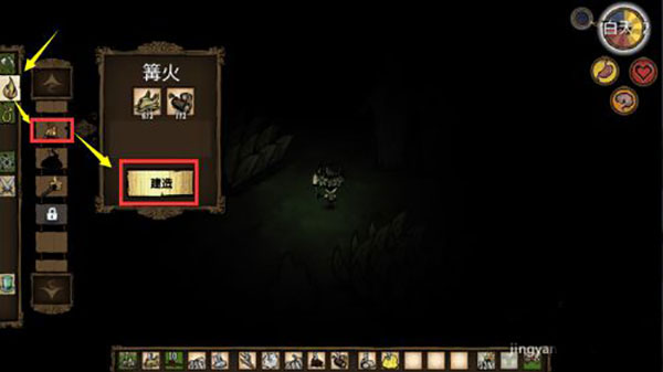 1、因为火把照明范围比较小,晚上天太黑尽量不要乱跑(防止跑到怪物点),生一个柴堆取暖即可。