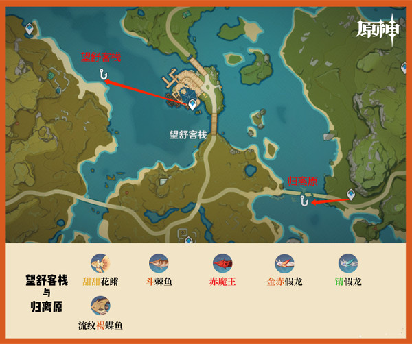 璃月钓鱼地点的鱼有:甜甜花鱂、擒霞客、水晶宴、斗棘鱼、流纹褐蝶鱼、苦炮鲀、赤魔王、金赤假龙、锖假龙、长生仙(特有鱼类)、花鱂。