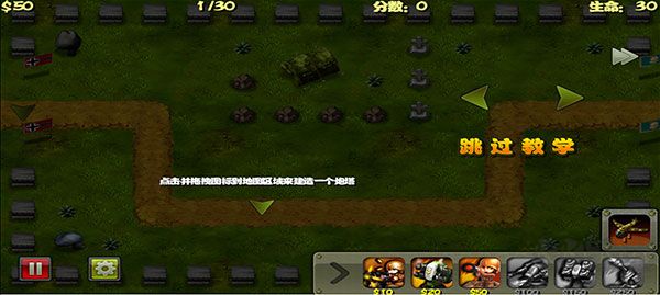 5、进入游戏后,选择其中一种将其通过拖拽的方式拖至场景里面阵型两旁即可摆放炮塔;