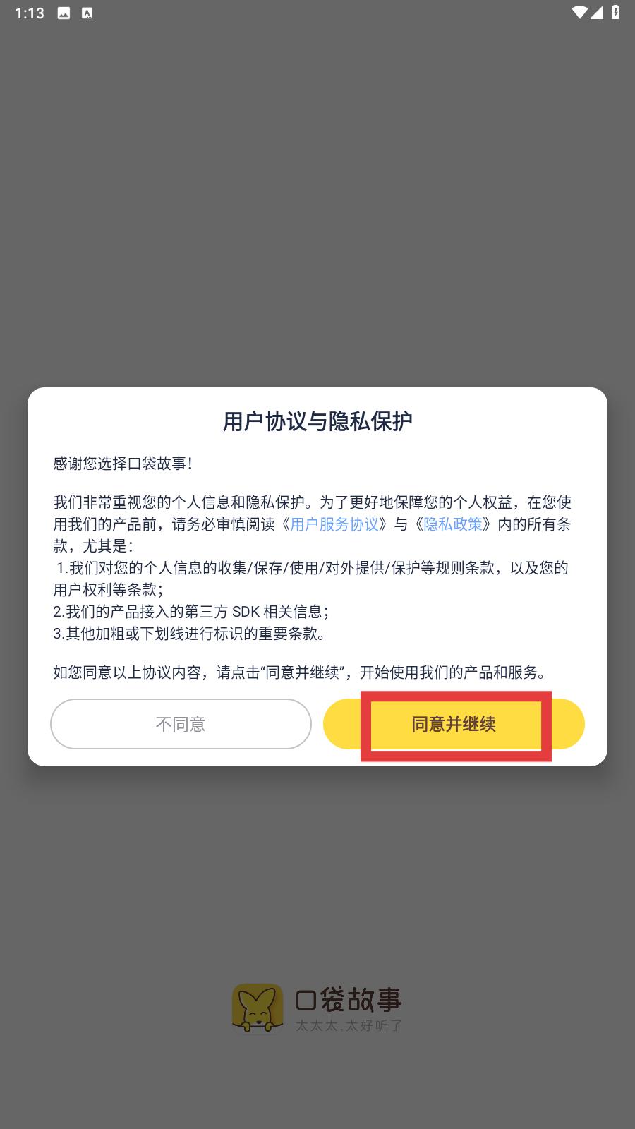 1、第一次打开软件,页面会跳出服务协议等,需要认真阅读软件给出的条款后,点击同意并继续下一步。