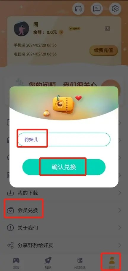 新用户注册登录野豹游戏加速器后,依次点击底部菜单栏【我的】------【会员兑换】------输入激活码【豹妹儿】------点击【确认兑换】,即可白嫖3-15天加速时长,赶快领取吧~
