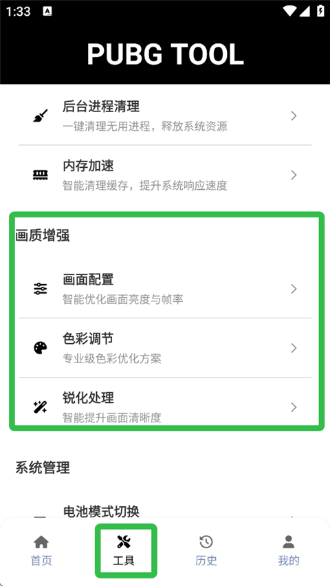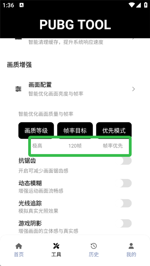 1、打开PUBG画质修改器120帧率软件,在【工具】页面的画质增强处可进行提升。