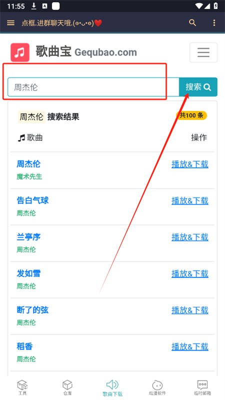 3、在歌曲下载页面,输入关键词可以快速找到想听的歌曲,直接就能播放或者下载