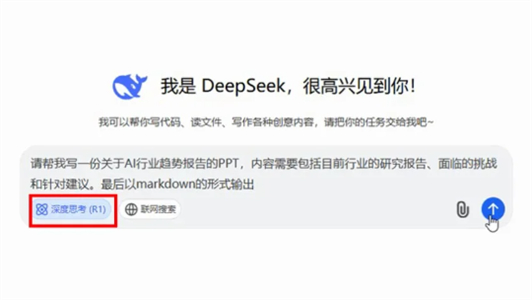 1、在DeepSeek中输入PPT主题,并选择【深度思考】,DeepSeek将生成详细的Markdown格式内容提纲。