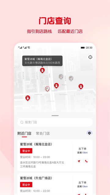 2、【一键查询】出门还能一键查询,帮助用户找到最近的蜜雪冰城门店,导航到店。