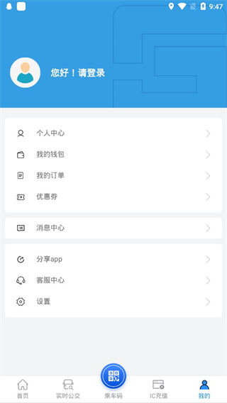 1、打开在本站下载的软件,进入首页,我们可以看到有IC卡充值、实时公交、账户充值等服务;