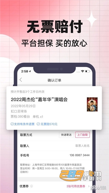 票牛全场满199顺丰包邮。票牛将在订单发货后短信通知您运单号,以便您跟踪查询。顺丰速运信息显示快递已妥投三日内,如用户未向票牛客服反映未收到快递或票品错误等问题,视为用户已收到并且认可所购票品,票牛将不再予以更换或退票。