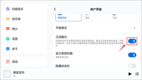 4、在用户界面设置中,找到沉浸模式,点击后面的开关按钮,如图所示。