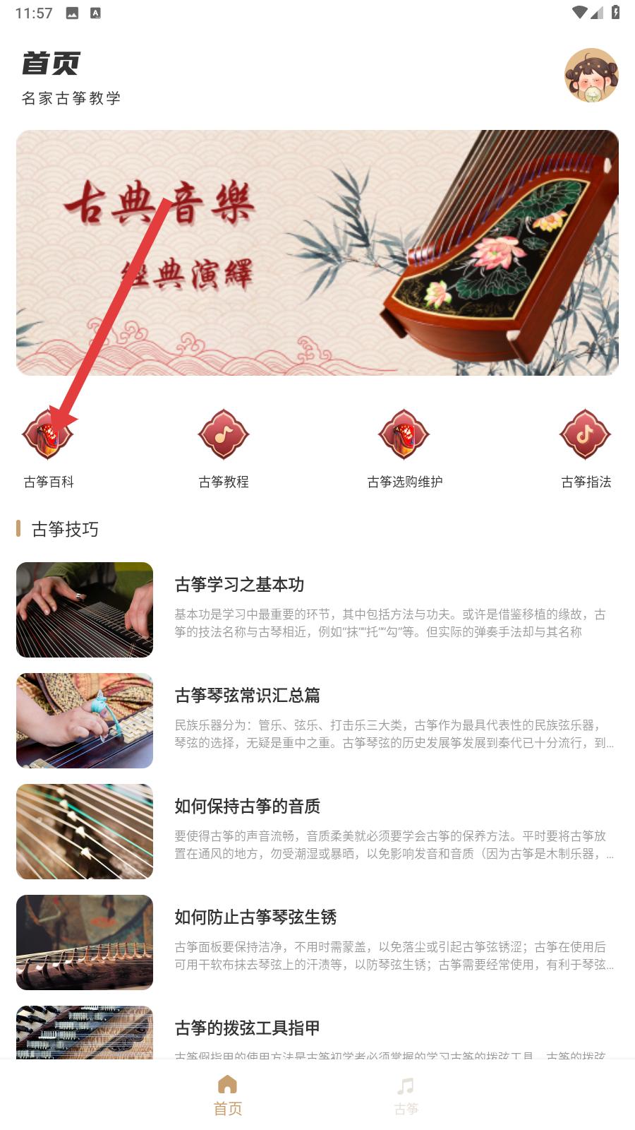 2、进入应用首页,在名家古筝教学板块下找到古筝百科图标,点击该图标,进入古筝百科页面。