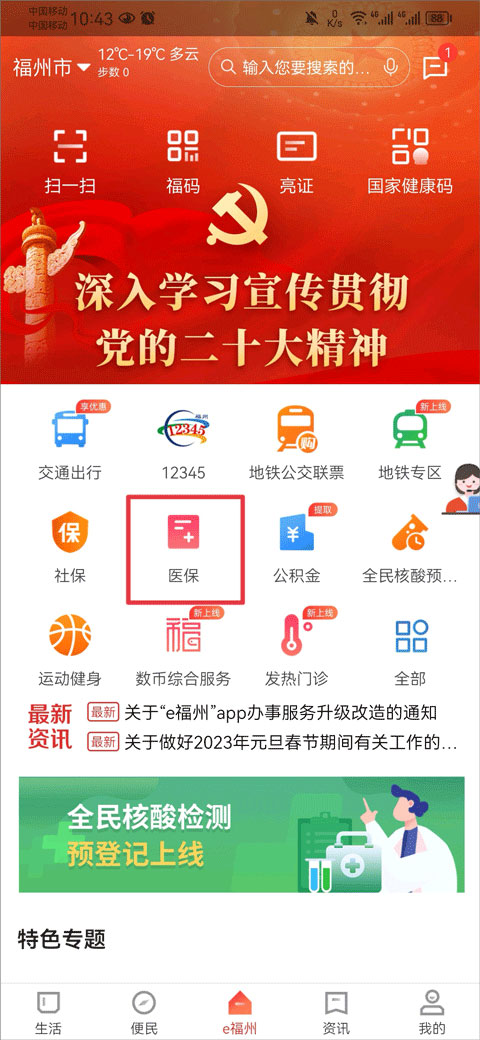 1、先打开e福州app,在首页中点击医保,静等几秒,跳转界面。