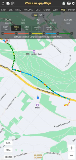 室外地图通过GPS及参数共同渲染的轨迹图,包括速率、RSRP、SINR、RSRQ、RxLev、EC/IO等,参数可以切换,可以直观的看到目前罹盖情况。如果导入了工参,地图会展示附近的基站。