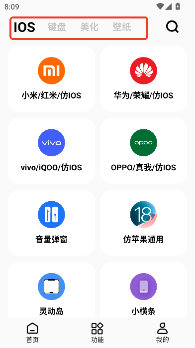首页有ios主题,键盘,壁纸,美化等多个板块内容