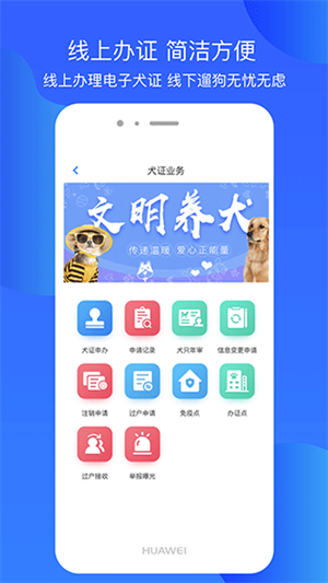 提供在线办理犬证犬牌、年审、补办犬牌等业务。在线申办犬证,方便养人获取唯一电子犬证,方便携带。可以在我的犬证里随时查看电子犬证。