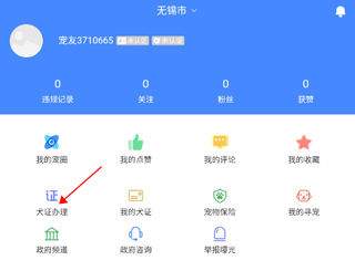 1、打开软件,点击“我的”选项,然后点击“犬证办理”选项。