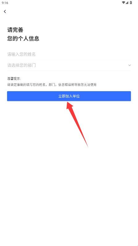 4、完善个人信息,包括真实姓名和所属部门,最后点击立即加入单位完成单位绑定流程。