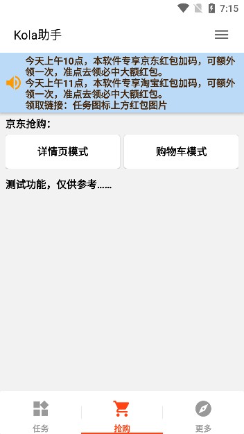kola助手是一款非常不错的抢购软件,用户通过软件就可以在这里抢购商品,各种各样的折扣商品和优惠活动,在这里都可以自由参与和抢购,在软件的帮助下,可以合理的规划自己的时间和任务,还能提高自己的工作效率,各种功能在这里都可以免费体验和下载。