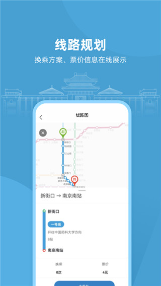 地铁线路图:用户可以通过该应用查看南京地铁的线路图,包括各线路的站点分布、换乘关系等。