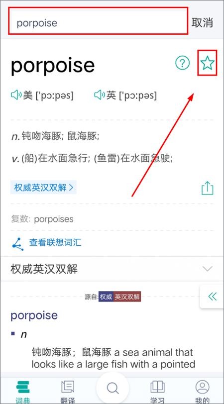 1、在app内搜索查询的生词,可以点击右上的“☆”加入到“我的生词本”里。