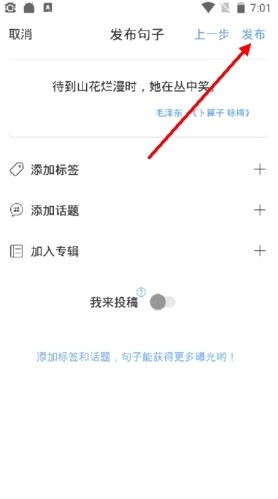 4、在下一步的页面中,可以添加标签、话题,想要投稿的话,则需要添加一张配图,如果发现句子有误,可以点击上一步回去修改,却无误后,点击右下角的发布,即可成功发布句子