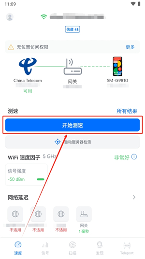 1、打开手机上下载的WiFiman应用,在首页【速度】点击【开始测速】按钮;