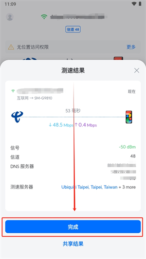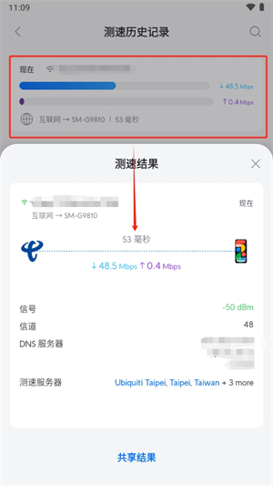 4、每次测试结束后会显示详细的测速结果,了解信号、信道、具体的上传和下载速度等信息;