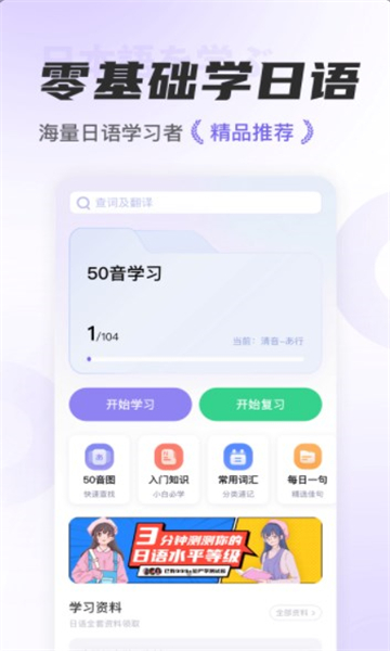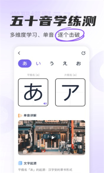-50音单音学习的听说读写练各个维度巩固,你可以通过学练测,复习等一全套流程多方位的掌握50音,最后能自由脱口而出,为日语入门打好坚实的基础