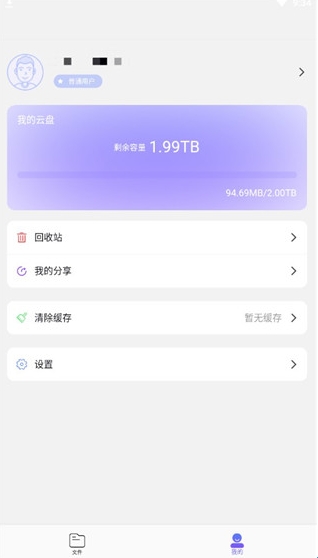 点击我的,可以查看剩余容量,回收站,分享历史等